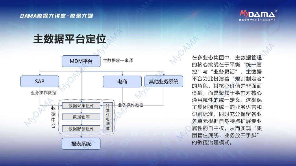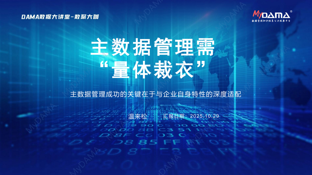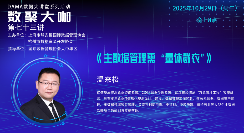 2025年10月29日晚,第七十三期“数聚大咖”活动在腾讯会议平台圆满完成。温来松老师,为大家分享《主数据管理需 “量体裁衣”》。数字化转型中,主数据是企业核心数据的“单一事实来源”,管理质量直接影响决策与运营效率。不同企业的行业属性、业务规模差异显著,通用模式难落地。本次分享依托DAMA主数据管理框架与实战经验,解析核心价值,聚焦企业特性对管理的关键影响,分享适配性搭建方法,助力企业避开误区,让主数据驱动业务增长。本次分享,为企业量身打造主数据管理体系提供可落地的实践思路。
